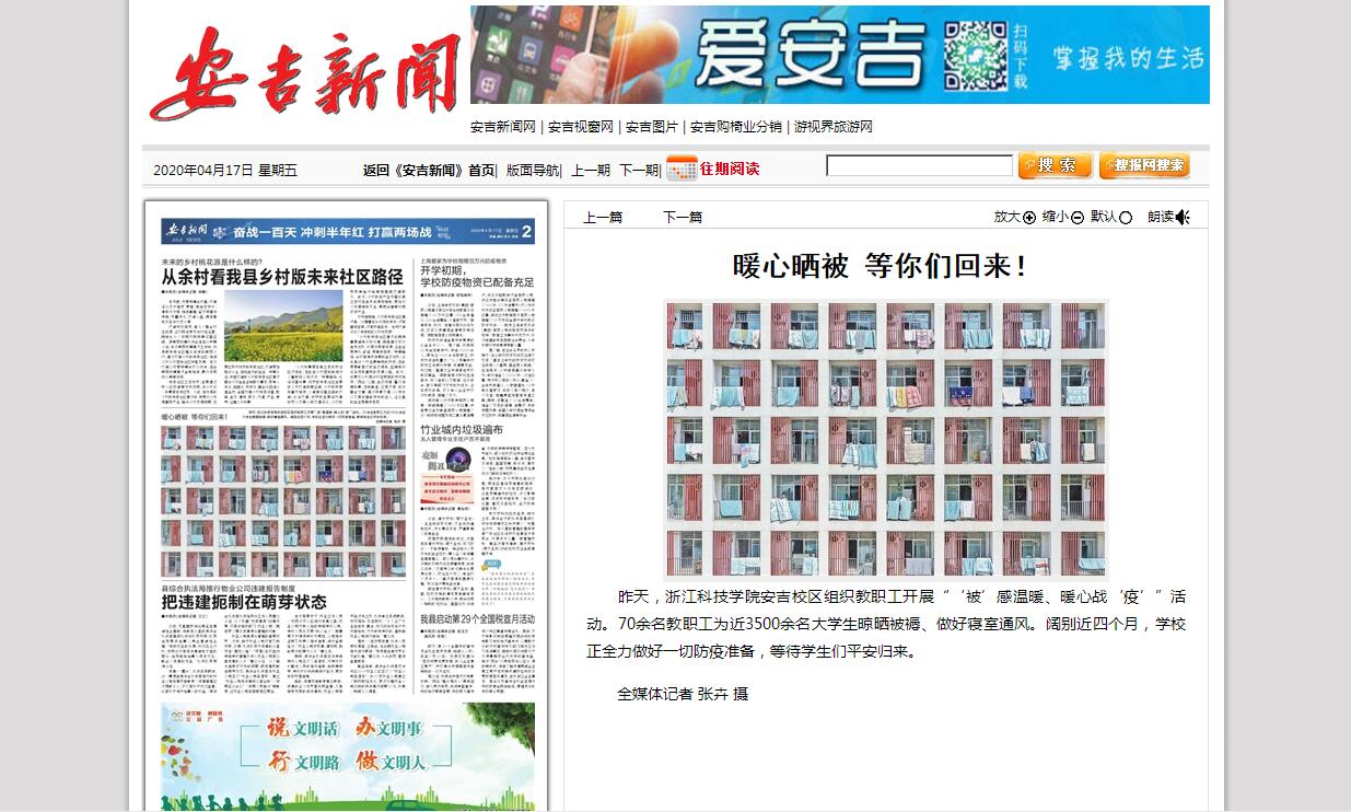 昨天,浙江科技学院安吉校区组织教职工开展“‘被’感温暖、暖心战‘疫’”活动。70余名教职工为近3500余名大学生晾晒被褥、做好寝室通风。阔别近四个月,学校正全力做好一切防疫准备,等待学生们平安归来。