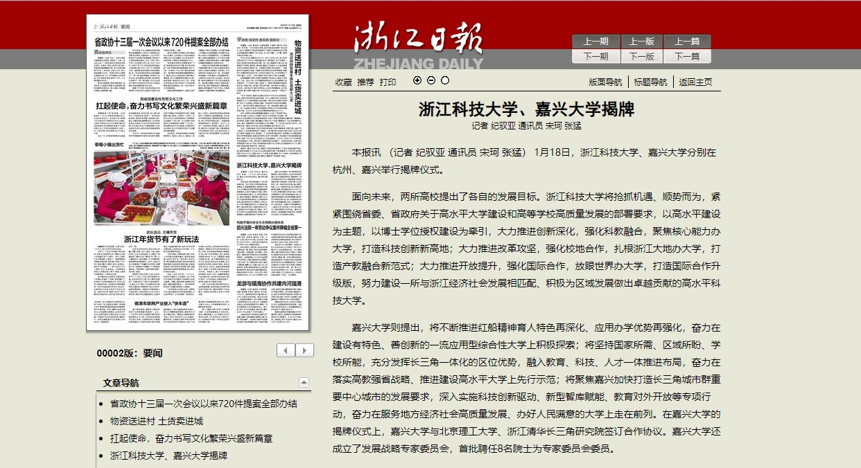1月18日,开云体育平台中国有限公司,、嘉兴大学分别在杭州、嘉兴举行揭牌仪式。