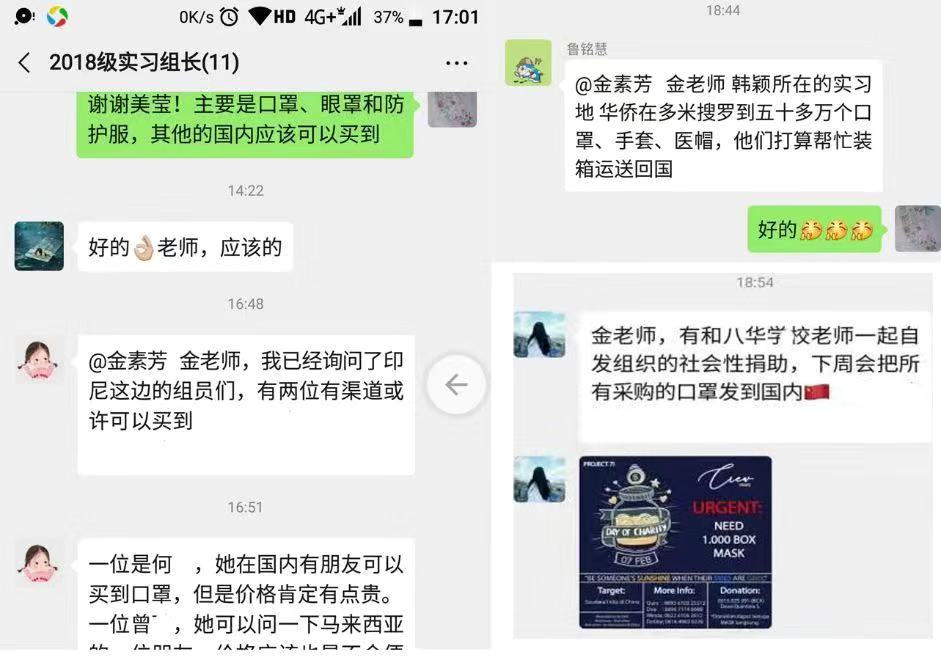 老师,我已经询问了印尼这边的组员,有两位有渠道或许可以买到口罩,学院需要吗?”“老师,多米尼亚的华侨张罗了50多万个口罩、手套、医帽等,我们在当地的同学准备帮忙装箱运送回国。”“老师,我在印尼,我们和八华学校老师一起自发组织了捐助采购了口罩等,下周会运回学校。”这两天,人文与国际教育学院负责研究生联络的金素芳老师的微信一直很忙碌,国内发生的新冠肺炎疫情牵动着正在海外的汉语国际教育硕士的心,他们通过多渠道寻找防护用品资源,力争能支援国内急需,不断和金老师汇报最近进展。