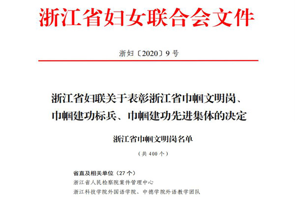 近日,我校外国语学院/中德学院外语教学团队被浙江省妇女联合会授予“浙江省巾帼文明岗”荣誉称号,为全省唯一获此殊荣的省属本科高校。