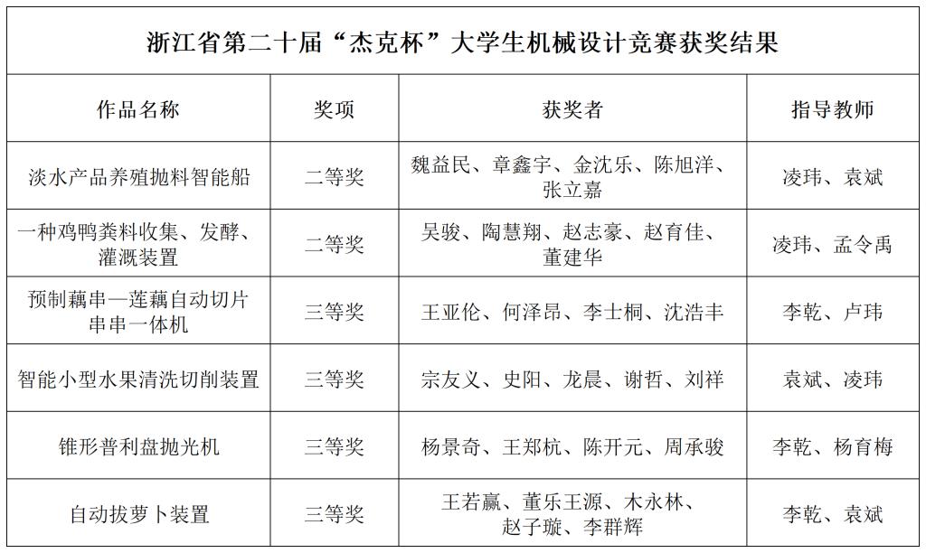 527-28日,浙江省第二十届“杰克杯”大学生机械设计竞赛在台州湾新区举行。我校机能学院7支队伍参加此次比赛,共获得本科组二等奖2项,本科组三等奖4项。