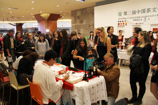 11月2日,罗马尼亚克鲁日巴比什•波雅依大学孔子学院举办的第三届茶文化节在克鲁日一大型商场举行。本次茶文化节以中国书法家龚小膑先生为孔院书写的“茶禅一味”为展示主题。超过2000名当地群众参加了各种活动,充分体现了克鲁日公众对中国文化的兴趣和热情。