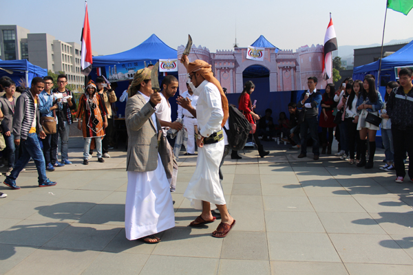 也门馆的腰刀舞以极强的音乐节奏感引来围观无数,使得场上观众与其一起载歌载舞;德国馆的啤酒和现场制作的图林根州烤肠、俄罗斯馆的传统小点心都受到了中外师生的欢迎和好评;卢旺达馆、埃塞俄比亚馆、印度尼西亚馆精美的手工艺品使观众长时间驻足观赏。中国文化体验馆展示的茶艺、汉服、绣花鞋、京剧脸谱吸引了广大留学生的眼球。当晚,各国留学生联手献上了一场民族服装秀。