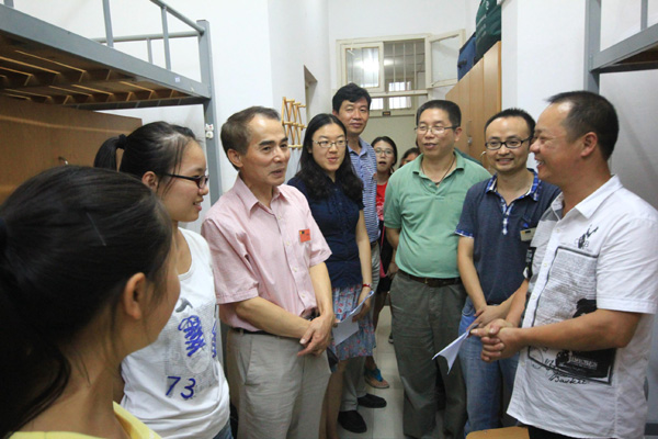 校党委书记王建华、校长叶高翔等校领导走进一间间寝室,与新生和家长话家常,询问他们的家乡情况、兴趣爱好以及到校后的感受,耐心地向他们介绍学校的特色,大学学习、生活的特点。对少数民族同学,校领导仔细了解他们的生活、饮食习惯,询问他们有何意见和要求,叮嘱后勤部门一一予以记录并尽力满足。对新生和家长反映的其他问题,校领导也一一耐心解答。在一间寝室,家长反映热水器“不灵光”,校领导和一起陪同走访的后勤公司工作人员马上现场办公,联系热水器供应商请他们尽快解决。