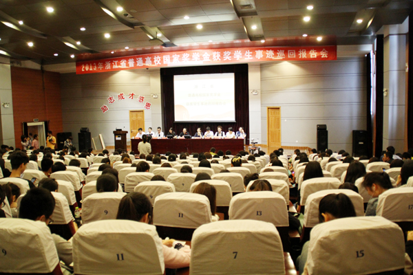 “感恩、励志、成才”浙江省高校国家奖学金获奖学生事迹巡回报告会近日在我校举行。省教育厅学生资助中心负责人、兄弟院校老师及我校师生400余人聆听了报告。