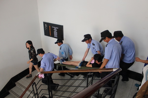为了模拟火场情景,达到学生体验火场应急疏散与逃生的效果,演练前工作人员在图书信息中心一楼放置了烟雾弹。15时30分,演练开始。一阵急促尖锐刺耳的警报声突然打破寂静,听到骤响的警铃后,同学们在图书信息中心工作人员及校卫队员的引导下,捂住嘴巴、鼻子,低头弯腰前进,快速、有序地从楼梯、疏散通道逃离至安全地带。在“火场”还发现两名学生被“烧伤”,应急救护人员启用担架“救”出伤员,火速护送“伤员”到救护车上进行急救。从警报铃声响起到最后一位学生撤离,仅用时5分钟。
