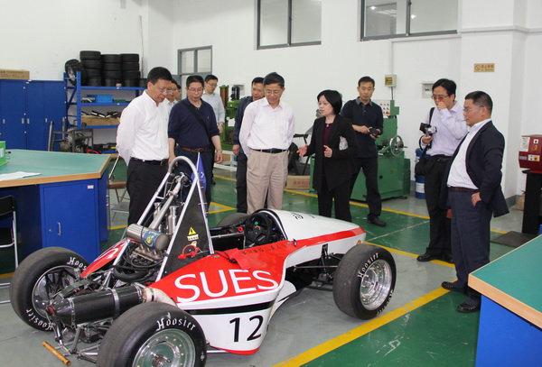 图2为王建华一行参观上海工程技术大学学生科技竞赛作品