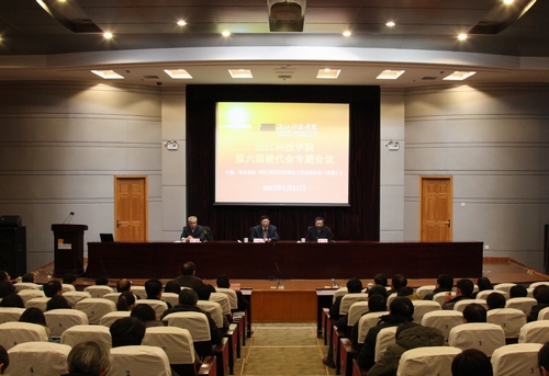 1月11日,学校召开第六届教职工代表大会专题会议。校党政领导班子成员,全体教代会代表、部分特邀代表、列席代表与会。会议听取和审议校长杜卫所作的“绩效工资实施办法的情况报告”,并投票表决通过《浙江科技学院绩效工资实施办法(草案)》。校党委书记王建华作总结讲话。会议由副校长吕进主持。