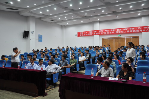 10月10日,浙江亚太机电有限公司来校举办宣讲会,企业决定在我校招收30名机械专业学生赴企业实习。亚太集团董事长黄来兴出席宣讲会并与我校学生做了面对面的交流。亚太机电副总经理施正堂、人力资源部负责人和我校教务处、机械学院负责人参加了宣讲会。会后,亚太机电即开始了学生选拔工作,30位同学将在近日赴亚太机电开展为期近一年的实习工作。