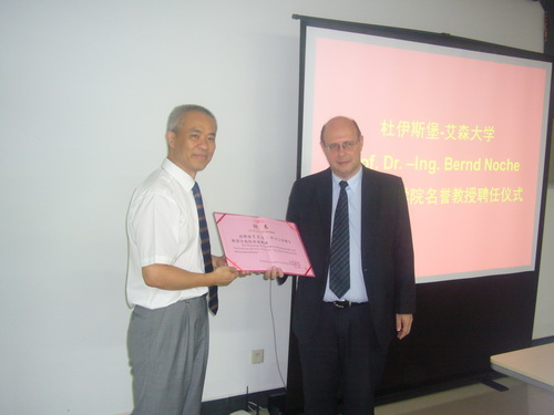 8月,我校与UDE签署了校际合作协议,合作领域涵盖师生交流、教学及科研合作、出版物交换、学术会议、文化活动交流等。在校际合作协议的基础上,机械学院与该校运输系统与物流系签署了共建“ZUST-UDE国际合作研究基地”的合作协议。签约仪式后举行了聘任仪式,受校长杜卫委托,副校长吕进代表学校向UDE运输系统与物流系主任Noche教授颁发聘书,聘请他为我校名誉教授。国际处、学科处等相关部门负责人参加了签约仪式。