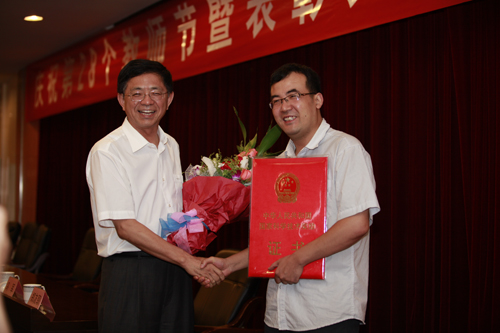 ( 图为学校教师节表彰大会上,校党委书记王建华为罗战友教授颁奖)