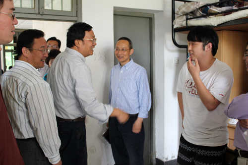 5月22日,校长杜卫、副校长冯军在相关职能部门、部分二级学院负责人陪同下,对学生宿舍环境卫生进行检查指导。