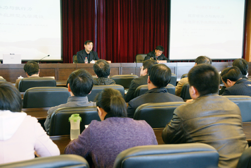 报告中,彭向刚指出,无论是企事业单位还是党政机关,无论是大学还是其他市场组织,面向社会、适应环境、参与竞争、实现使命,最重要的因素是三个方面,一是代表这个组织的高度和未来,体现目标和战略的领导力;二是体现办事公平与效率的执行力;第三是体现这个单位主体素质的干部队伍。如果把领导力当做高度,执行力就是速度,干部素质就是厚度,要想建设好一所大学,实现我们自己的办学目标,这三个层次非常重要,是关系核心竞争力的焦点。