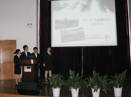 本届比赛,选手们对绿色化学品碳酸二甲酯进行工厂化设计,从厂址选定、工艺确定、设备选型及经济核算等全部由队员完成。决赛场上,每组选手用PPT进行陈述,接受评委和观众提问,队员的表现50%由评委决定,另外50%则由队际互评决定。经过激烈角逐,我校获二等奖和优胜奖各一项。