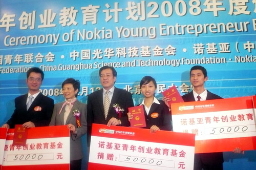 12月12日,由全国青联、中国光华基金会等联合举办的“全国诺基亚青年创业教育计划2008年度颁奖典礼”在北京举行。我校生化学院朱璐等同学的作品《建立曼博瑞恩有限责任公司》获 “2008年全国青年创意•创业计划大赛”金奖,校团委李俊荣获“2008年度全国青年创业教育先进个人”称号。