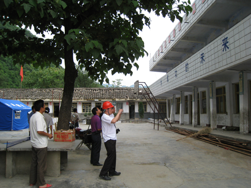 我们还去了东溪河乡小学。该校在5.12地震中受损情况相对于其他学校还不是特别严重,主教学楼完好无缺,但是教辅用房和学生宿舍受损严重,已经成为危房,搭建的板房主要用途为教辅用房和学生宿舍。板房搭建地点设在学校的操场上,辅助设施利用原有的,板房搭建好后只需考虑通电问题。由于情况相对较好,板房工程在我们来之前就搭建完成。下午回到驻地金台小学后得知羊木镇的康泰人寿保险公司职员为金台小学捐款,我和卿工毫不犹豫的每人各捐了500元。