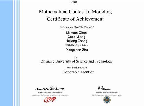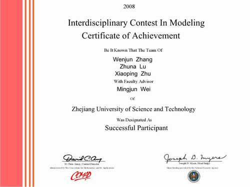 本届“美国国际大学生数学建模竞赛”在2008年2月14号—2月18号举行,共有十多个国家近4000支队参加。我校组织两支队伍参赛,由理学院选派经验丰富的朱勇珍博士、韦明俊博士担任指导老师。两组队员放弃寒假及过年休息的时间全身投入比赛,在机房奋战四天四夜,两位指导老师也在机房坚守了四天四夜。最终取得我校国际比赛成绩历史性突破,标志着我校的学生课外科技实践教学工作又取得新的成绩。