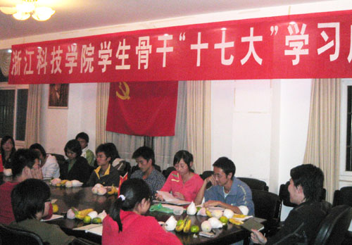 10月16日,校“邓读会”、建工学院“邓读会”分别组织学生骨干学习。校邓读会学术部部长郑婧同学说:“我们要用实际行动,努力创造符合时代主流的先进校园文化,打造属于我们浙江科技学院自己的文化品牌!”人文学院邓读会分会负责人车新波说:“作为21世纪的接班人,学习关注十七大,对今后自己的学习工作都能很大的指导作用,同时希望自己的思想政治觉悟得到进一步提高,为将来报效祖国作好准备。”同学们发现,十七大报告离我们大学生很近,大会报告每一点都实实在在,和谐的社会为我们创造了一个大的良好的生活环境,而不断发展的经济则是为我们大学生毕业以后可以谋得更好的出路;进步的科教和繁荣的文化更是我们目前最为关心和实际的问题。