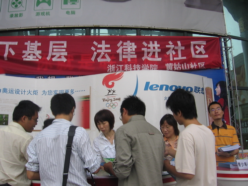 9月28日上午,“思政基础”教研室的教师们组成“社科下基层”小分队,在黄姑山社区数码颐高广场组织了“社会下基层、法律进社区”的社科普及活动,向社区居民宣传了《物权法》等新法,并解答了他们在实际生活中遇到的一些法律问题,受到社区干部和广大群众的好评。
