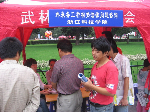 9月22日,人文学院“思政基础”教研室教师于浙江省’2007社科普及周活动开幕之际,在武林广场开展了“外来务工人员相关法律问题”和“青少年儿童成长成才”咨询活动,吸引了许多公众,教师们对现场咨询群众提出的问题予以认真细致的回答,并赠送了相关的宣传资料。
