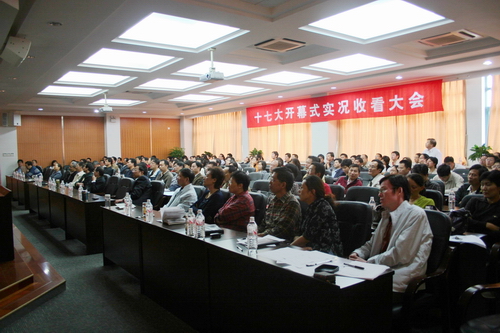 上午9点不到,行政楼328会议室内校、院两级理论学习中心组全体成员及思想政治理论课教师等150余人就开始等待收看十七大开幕直播。同时,各二级学院组织没有课的学生在综合楼食堂、宾馆食堂和2K食堂等收看点收看了电视直播。会议持续的两个多小时中,广大师生们神情专注地倾听了胡锦涛总书记的重要报告。