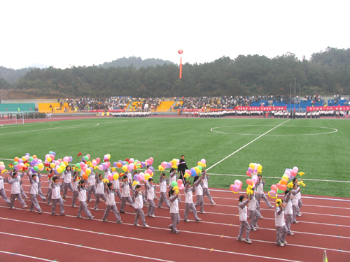 校长杜卫宣布:“第二十五届运动会开幕!”五彩的气球和数百只象征希望的鸽子一起飞入云霄。