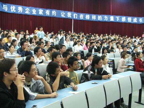 精彩的演讲后,是一个小时的互动提问环节。“如果我进入你的公司,你将如何发现我这匹千里马,并把我培养成骨干?”、“对一些刚毕业的大学生,你觉得他可以从哪些途径来获得资金去创业?”、“30岁是一个人的黄金时期,你如何看待在30岁还没有成功?”、“你对自己的职员是比较注重他的IQ、EQ或是AQ?”……这些问题道出了大学生对创业的渴望和对成功的梦想。