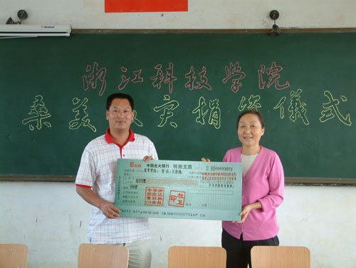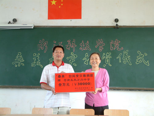 9月26日,校纪委书记鲁凤在校团委书记郑友取等陪同下赴温州苍南台风灾区,向受灾的五凤乡中心学校送去了学校和全体教师的爱心捐款8万元,并在五凤中心学校举行了救灾捐资仪式。