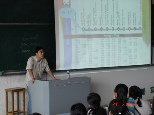 赴澳教师团团长陈靓老师首先代表17位出国培训的英语教师对学校及学院给予的支持和帮助表示衷心的感谢,并向在座老师和同学们介绍了他们在澳洲培训的过程,包括学习、生活、旅行中的收获和遇到的各种问题。赴澳教师代表孟冬、樊燕龙、冯巧娥和王旭莲分别就吃、住、学、行等几个方面汇报了自己在国外生活的体会,并向大家展示了他们拍摄的境外风光。