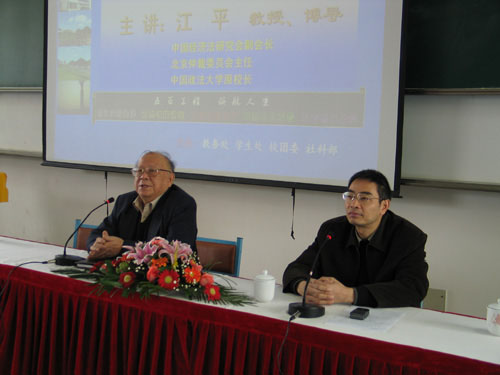 讲到大学生的正义观,江教授运用‘罗马司法女神像’和我国制定《物权法》的事例,指出从法律角度讲,正义就是公平和平等,大学生应当学会正确理解形式平等和真正意义的平等。