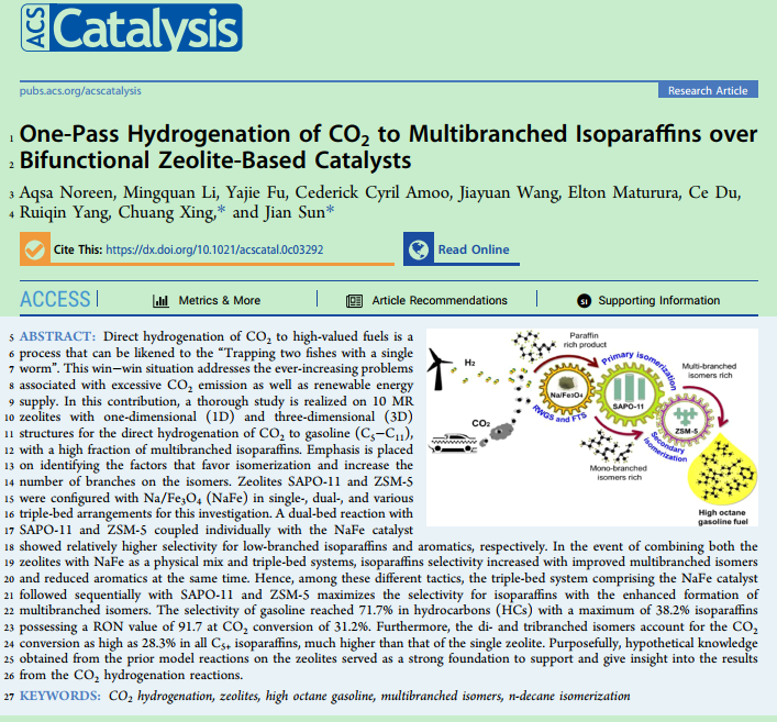 该论文创新开辟了温室气体二氧化碳直接制备高辛烷值汽油合成路线,产物汽油辛烷值高达92%(相当于92号汽油)。此外,Aqsa 还与导师、同学合作刊发SCI文章2篇,其中,《Syngas to isoparaffins: Rationalizing selectivity over zeolites assisted by a predictive isomerization model》发表在《Fuel》上,《Fabricating Fe Nanoparticles Embedded in Zeolite Y Micro-Crystals as an Active Catalyst for Fischer-Tropsch Synthesis》发表在《ACS Applied Nano Materials》上。