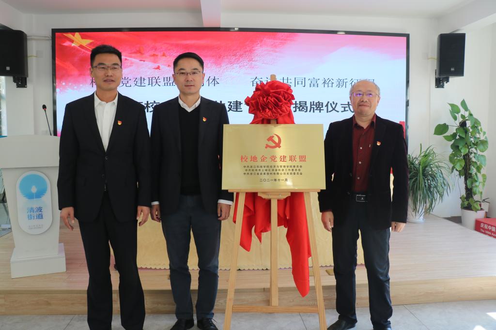 校地企党建共建联盟启动仪式上,学院党委书记黎东升与清波街道党工委书记蒋晓斌、浙江省皮革塑料有限公司支部书记葛颖共同为“校地企党建联盟”揭牌;揭牌仪式后,经管学院关高峰副教授和于兰华副教授分别以《杭州市物流规划解读及上城区物流发展思考》和《新时代基层社会治理实践与创新思考》为题作专题报告。