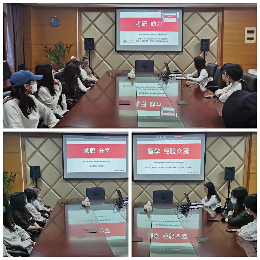 近日,经管学院举办“经彩上岸”考研、出国和就业系列经验分享会,2018级学生以线上线下的形式分享考研、留学与就业求职方面的成功经验。学院团委书记和辅导员、2019级同学参会。
