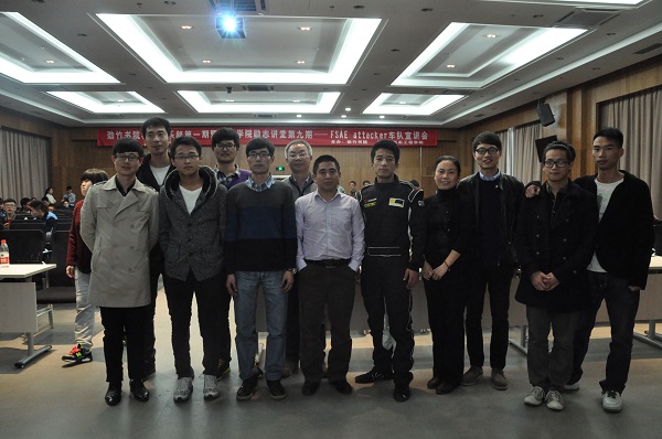 11月27日下午,曾获全国大学生方程式汽车大赛18名好成绩的由科院车队倾力打造的第一代赛车首次正式亮相安吉校区,劲竹书院精英俱乐部第一期暨机械学院第九期励志讲堂FSAE attacker车队宣讲会开讲。机械学院相关负责人及车队指导教师等参加。