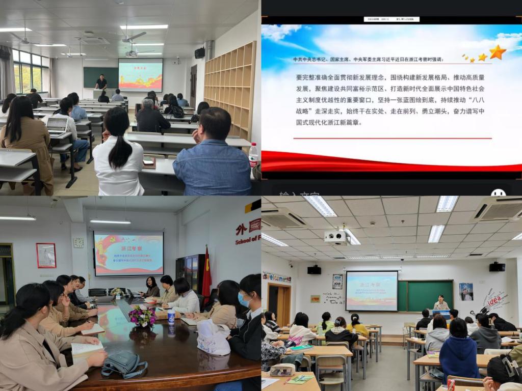 日前,外国语学院通过主题党课、大会宣讲、现场学习、特色理论宣讲团等多种形式,在学院内迅速掀起学习宣传、贯彻落实习近平总书记考察浙江重要讲话精神热潮。