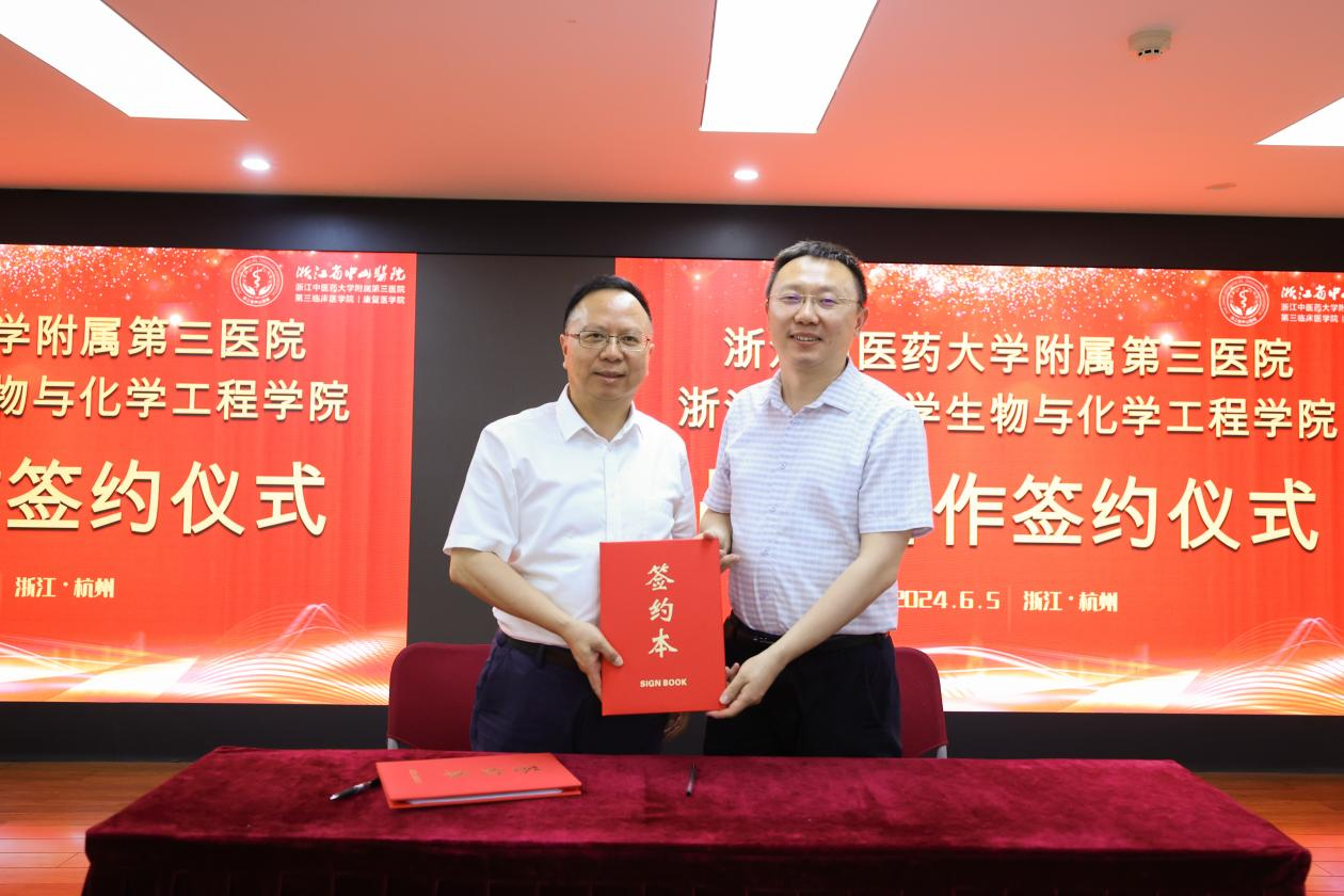 6月5日,生物与化工学院—浙江中医药大学附属第三医院战略合作协议签约仪式暨医工结合研究与转化中心启动会举行,浙江省卫生健康委中医传承创新处、浙江中医药大学科研部、浙江中医药大学附属第三医院相关负责人,生化学院相关负责人出席签约仪式。