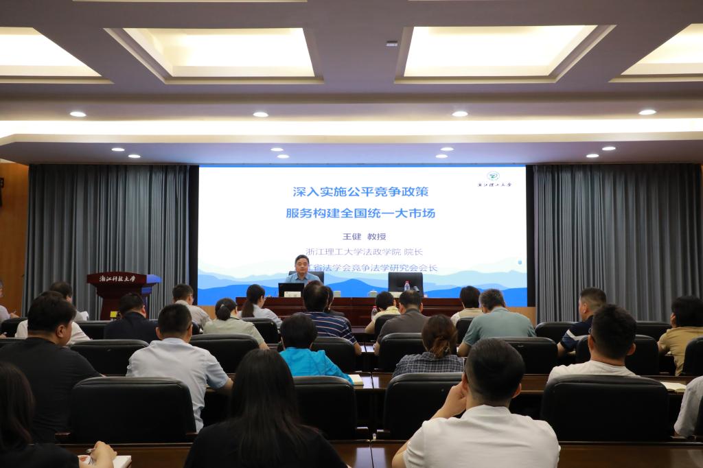 6月19日上午,由机关党委主办,审计处采购中心党支部承办的机关党委党员干部集中学习扩大培训会在行政楼328会议室举行,副校长陈平出席会议。浙江理工大学法政学院院长、经济法研究所所长、二级教授王健受邀作题为《深入实施公平竞争政策 服务构建全国统一大市场》的辅导报告。